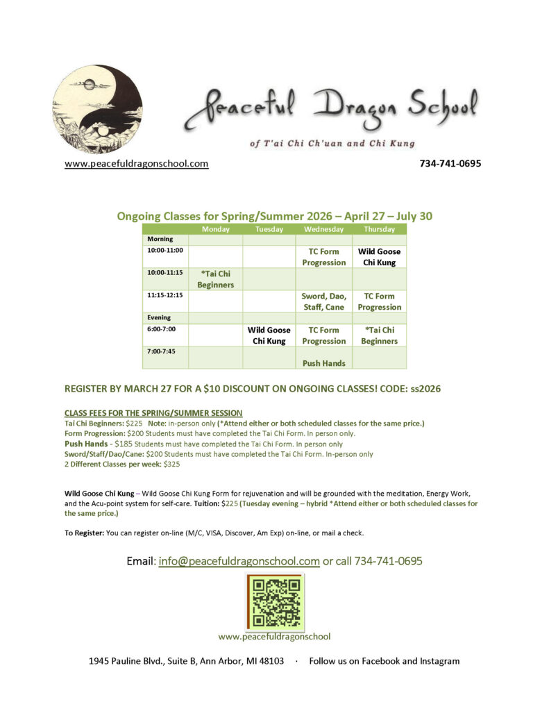 The Peaceful Dragon School of T’ai Chi Ch’uan and Chi Kung offers comprehensive learning in Basic, Intermediate, and Advanced T’ai Chi Ch’uan (TCC), as well as Basic and Intermediate Chi Kung (Qigong). Classes begin about the second week of September; second week of January; and the last week of April. For mini workshops at the school and national seminars check the Calendar of Events. Want to have an off-site class or workshop? Call Master Young.
